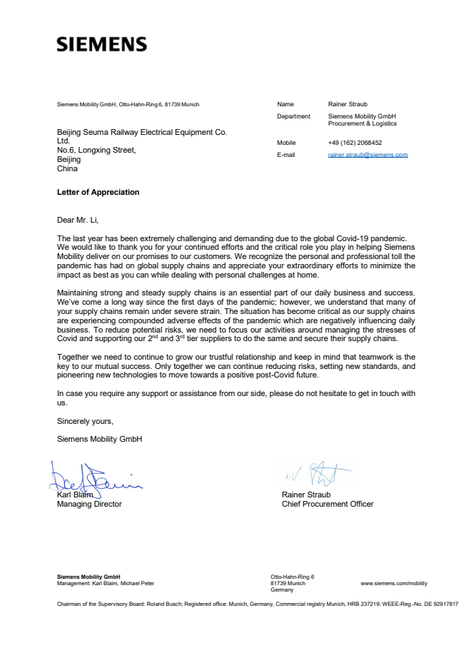 北京森瑪鐵路電氣設(shè)備有限公司成立于2007年6月,注冊資金330萬美元,是一家生產(chǎn)鐵路電氣化設(shè)備的德國獨資企業(yè),擁有獨立的進(jìn)出口經(jīng)營權(quán)。公司占地面積6000㎡,辦公及生產(chǎn)面積3000㎡。2008年5月公司通過德國萊曼博士認(rèn)證機(jī)構(gòu)DIN EN ISO9001:2000認(rèn)證。2011年1月通過ISO9001質(zhì)量管理體系認(rèn)證,于2018年11月成為北京市高新技術(shù)企業(yè)。